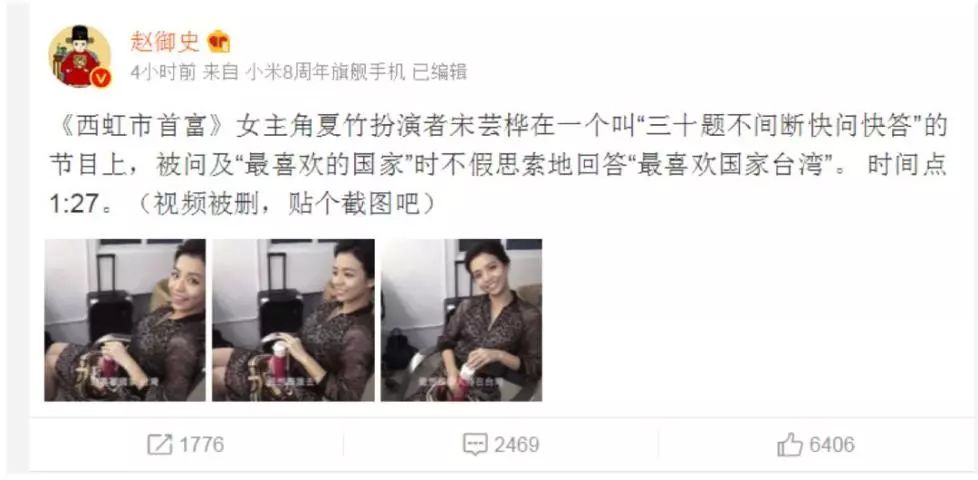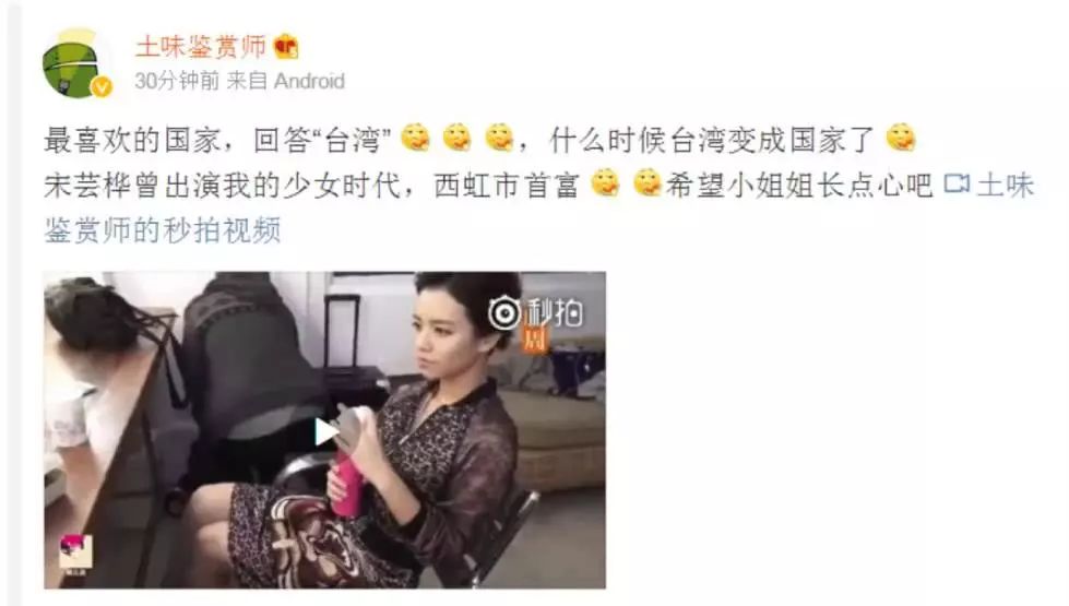 有網(wǎng)友在微博爆料,《西虹市首富》女主角夏竹扮演者宋蕓樺,在一個(gè)節(jié)目上被問到“最喜歡的國家”時(shí),不假思索的答案是“最喜歡國家 臺(tái)灣”。