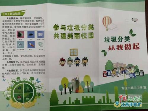 中國(guó)江西網(wǎng)/九江頭條客戶端訊 通訊員趙建華報(bào)道:為營(yíng)造“垃圾分類(lèi)光榮”的良好氛圍,使師生真正養(yǎng)成生活垃圾分類(lèi)的強(qiáng)烈意識(shí)和良好的行為習(xí)慣。9月16日上午,九江三中高三年級(jí)組織各班召開(kāi)主題為“愛(ài)護(hù)環(huán)境,保護(hù)地球,一起做好垃圾分類(lèi)”的專(zhuān)題班會(huì),組織學(xué)習(xí)垃圾分類(lèi)知識(shí),并通過(guò)開(kāi)展發(fā)放垃圾分類(lèi)宣傳冊(cè),出專(zhuān)題黑板報(bào)等活動(dòng),將垃圾分類(lèi)教育活動(dòng)落到實(shí)處。
