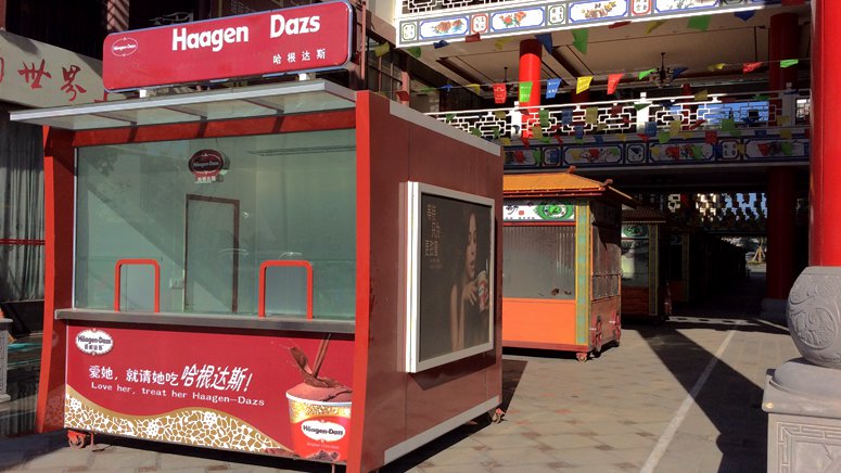 云南瑞麗金星貿(mào)易集團(tuán)哈根達(dá)斯售貨亭,外墻材料為鍍鋅板,造型拉伸折彎可多變,顏色多選。汽車噴漆工藝,氟碳噴涂顏色均勻,30年不掉色,復(fù)古花紋滲透文藝氣息。